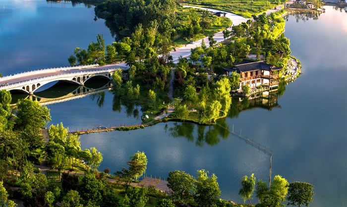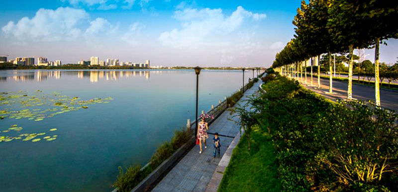 平湖歸雁景區(qū)緊鄰黃州大道,規(guī)劃面積30萬平方米。該景區(qū)視野通透,首先映入眼簾的是一灣平靜的湖水,不由得聯(lián)想起蘇東坡《西江月》中“點(diǎn)點(diǎn)樓頭細(xì)雨,重重江外平湖”的詞句。徜徉于湖邊樹下,忽見開闊的湖面上空飛來一群雁陣,感受大雁歸來的喜悅,實(shí)為人生樂事。蘇東坡《調(diào)笑令》中“歸雁,歸雁。飲啄江南南岸”的詞句,也與此情此景交融相映。該景區(qū)是市民戶外運(yùn)動休閑的功能區(qū)。