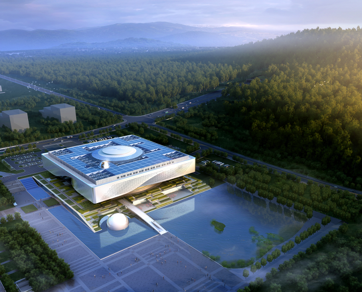 新館建筑外形為一個(gè)富有湖北元素的巨大活字創(chuàng)想造型,整個(gè)建筑將科技館大廳處理為圓形,以活字拼接為主題的展廳設(shè)計(jì)為方形的空間,兩個(gè)空間通過(guò)旋轉(zhuǎn)的外形銜接,運(yùn)用自然界中廣泛存在的黃金對(duì)數(shù)螺旋連接圓形的大廳與代表活字印刷的方形展示空間,整個(gè)建筑又像電腦的芯片,寓意光谷之芯,從而完整體現(xiàn)出時(shí)間和空間的交融、科技與未來(lái)的連接,呈現(xiàn)出動(dòng)態(tài)的科技美感。為體現(xiàn)湖北千湖之省的美譽(yù),結(jié)合城市公共空間與廣場(chǎng)水景的設(shè)計(jì),球幕影院依臺(tái)傍水,局部似凌駕水面,水波浮影,營(yíng)造出科技與人文交織的空間意趣。